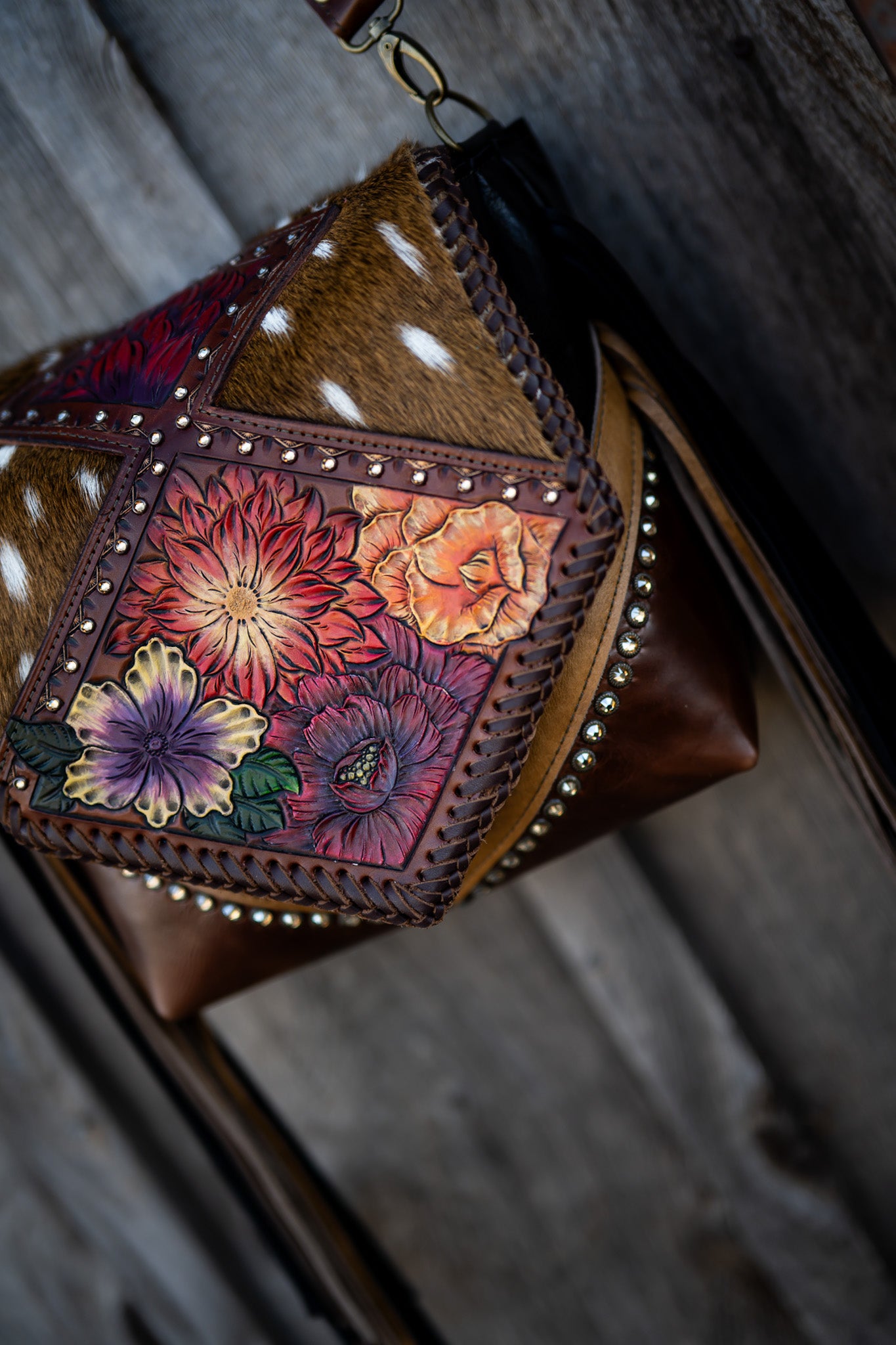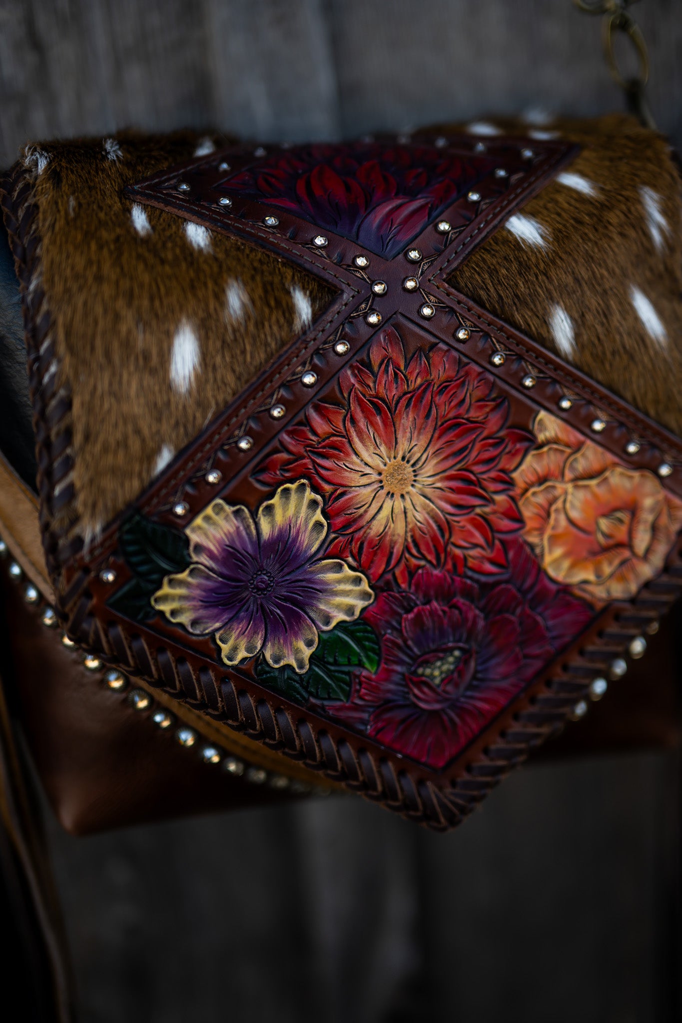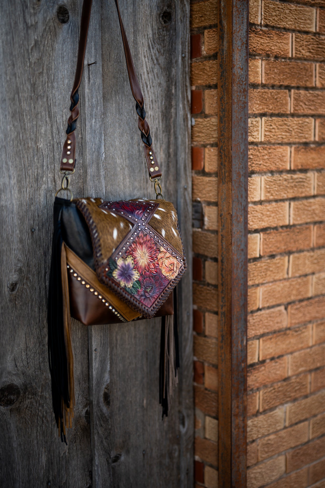 This bag measures 13”x11”x5” and has a 45” crossbody strap. Fringe is 16”. There is a cell phone pocket on the back and the interior is lined and has 3 pockets, one zips. The flap has a magnetic closure.