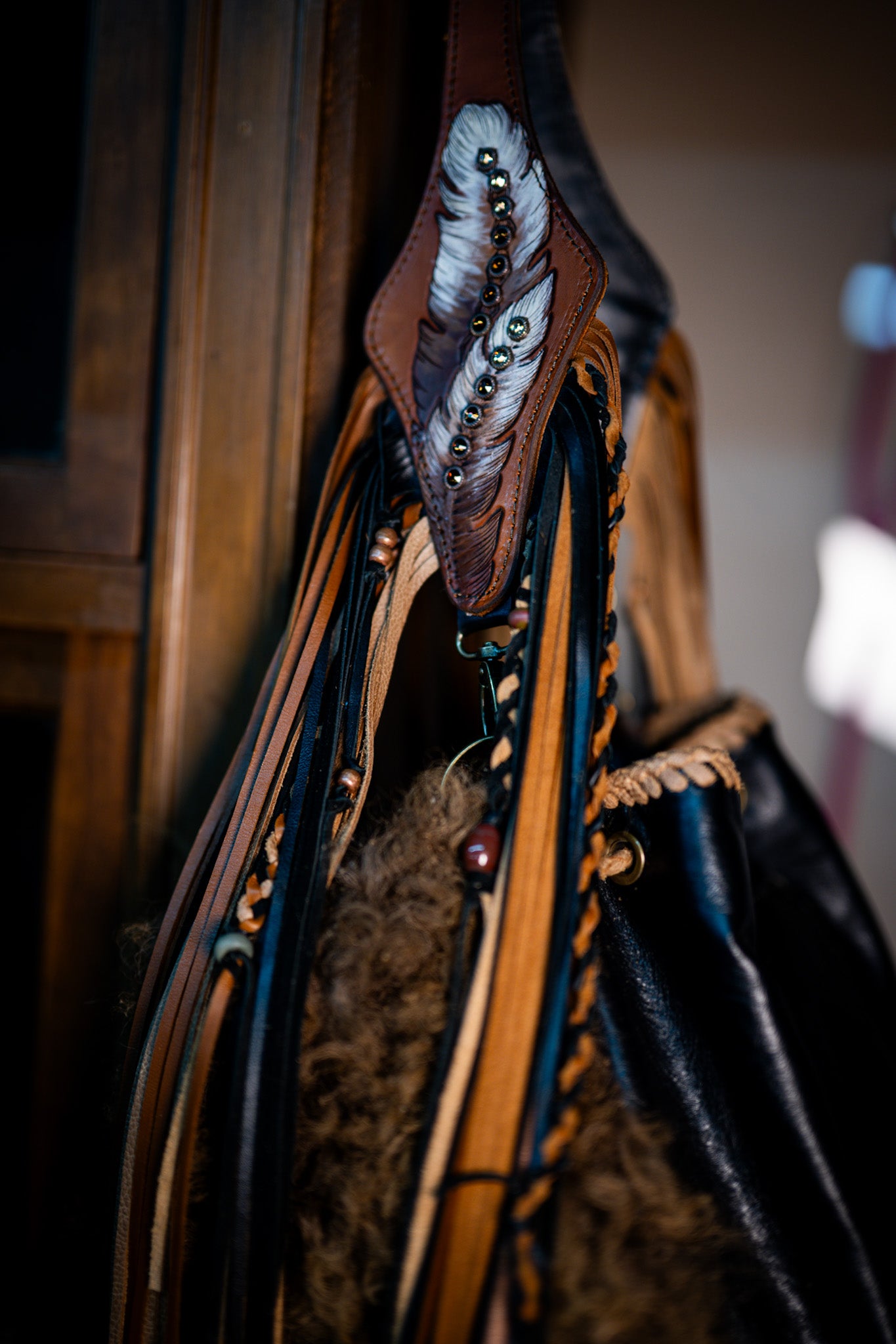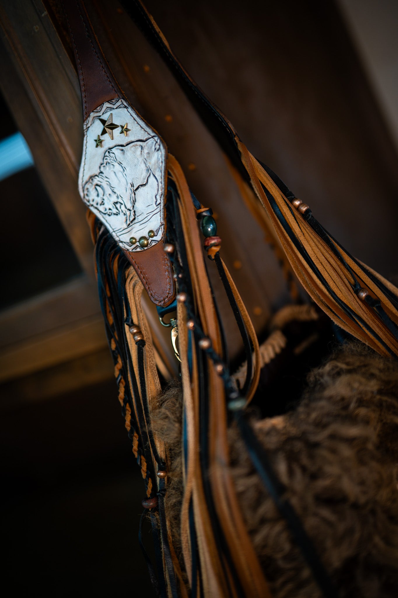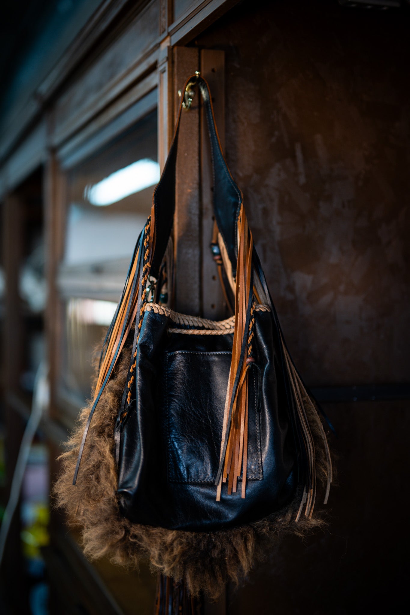 This bag measures 17”x15”x6” and comes with beaded and textured fringe on the tassels and strap. The removable strap measures 30”. It comes with a cell phone pocket on the back and the interior is lined and has 3 pockets.