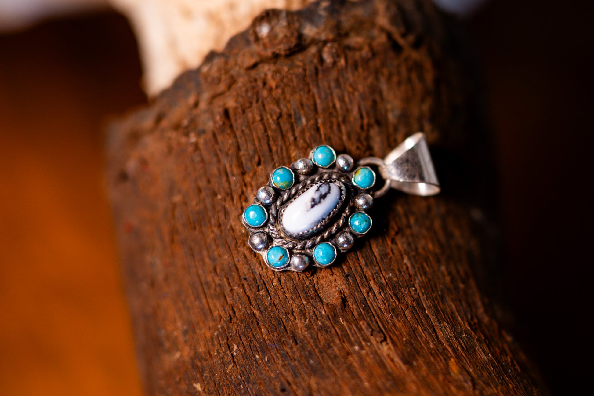 White Buffalo, turquoise, and sterling silver cluster pendant, would look absolutely perfect on pearls for a stand alone statement or as an everyday piece!