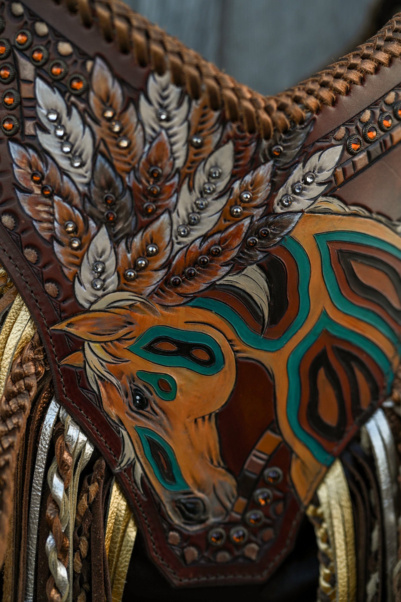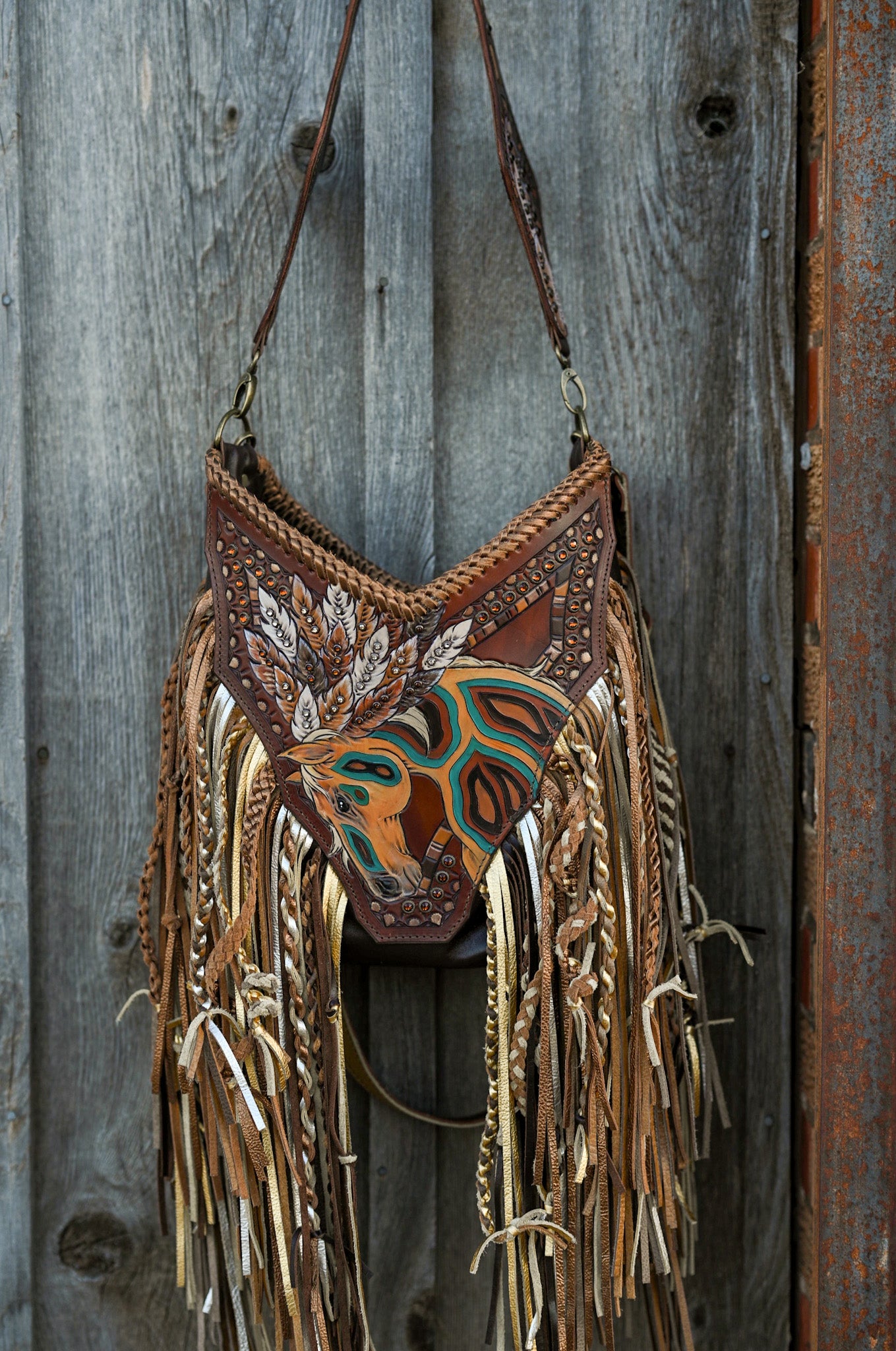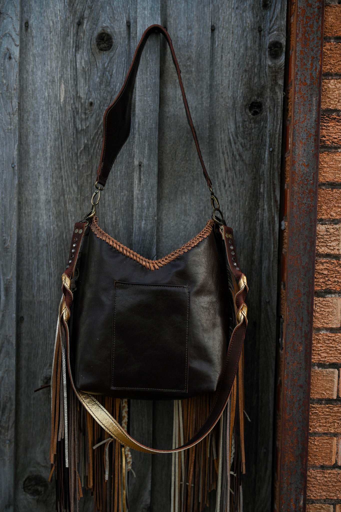 It measures 13”x11”x5” and has a 30” shoulder strap and a 45” crossbody strap, though the neckline of the purse adds several inches. Fringe is 16” and textured. There is a cell phone pocket on the back and the interior is lined with one zipping pocket and two small drop in pockets. The bag has a magnetic closure.
