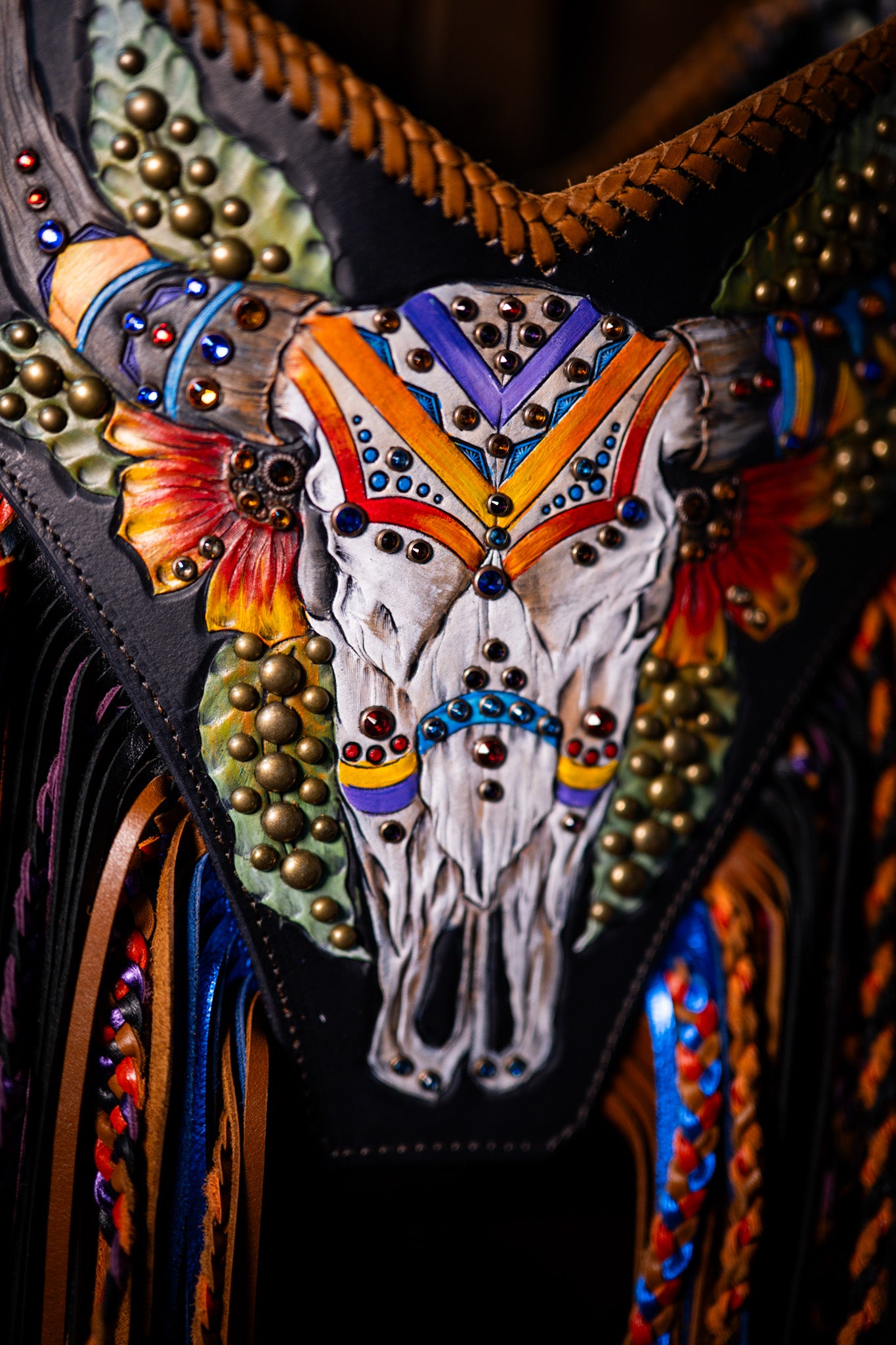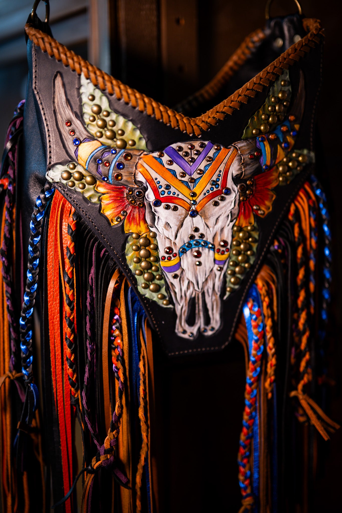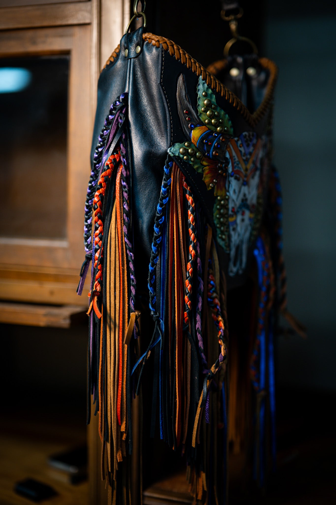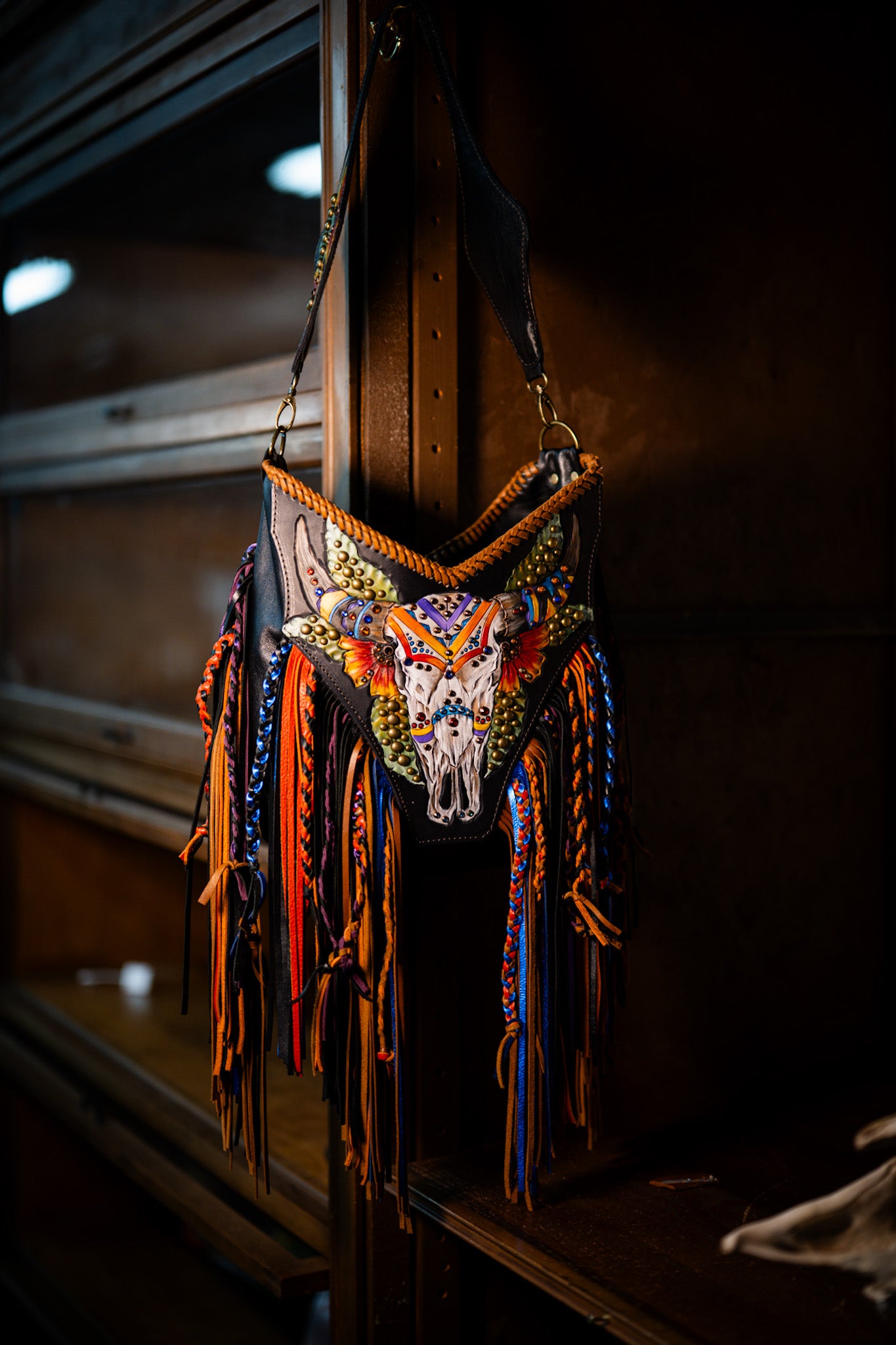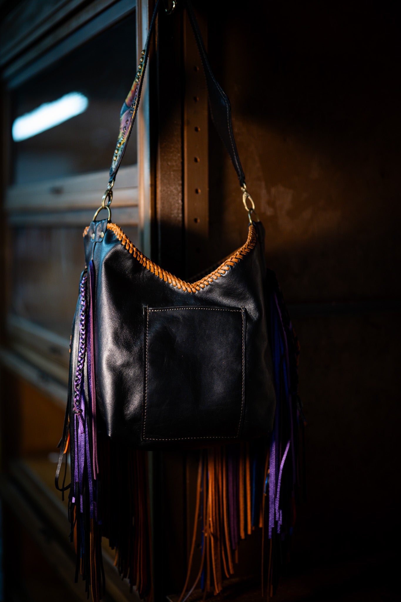 It measures 13”x11”x5” and has a 30” shoulder strap and a 45” crossbody strap, though the neckline of the purse adds several inches. Fringe is 14”. There is a cell phone pocket on the back and the interior is lined with one zipping pocket and two small drop in pockets. The bag has a magnetic closure.