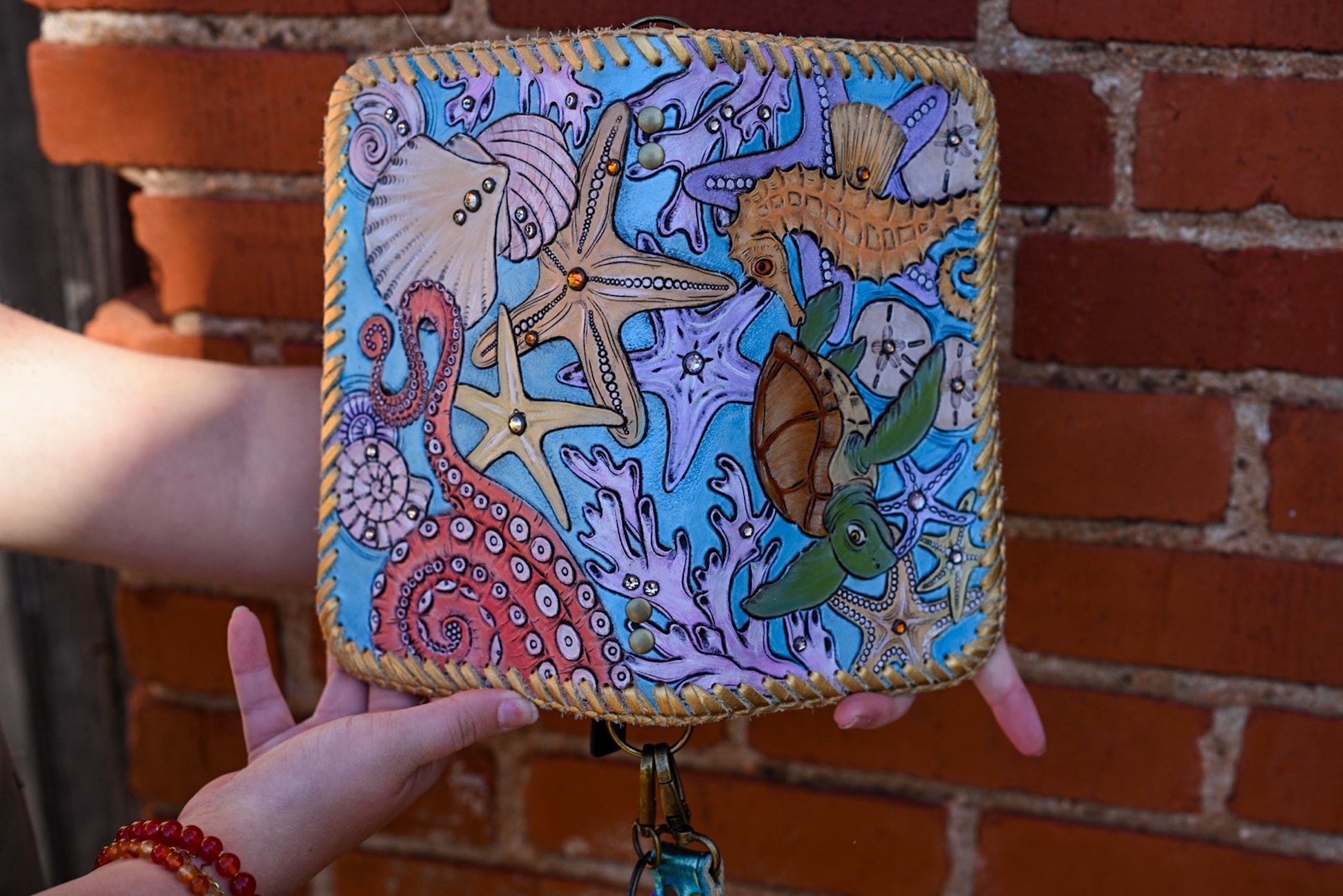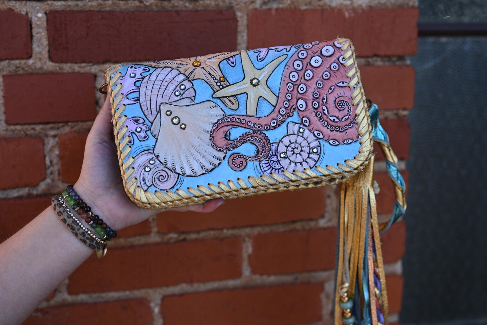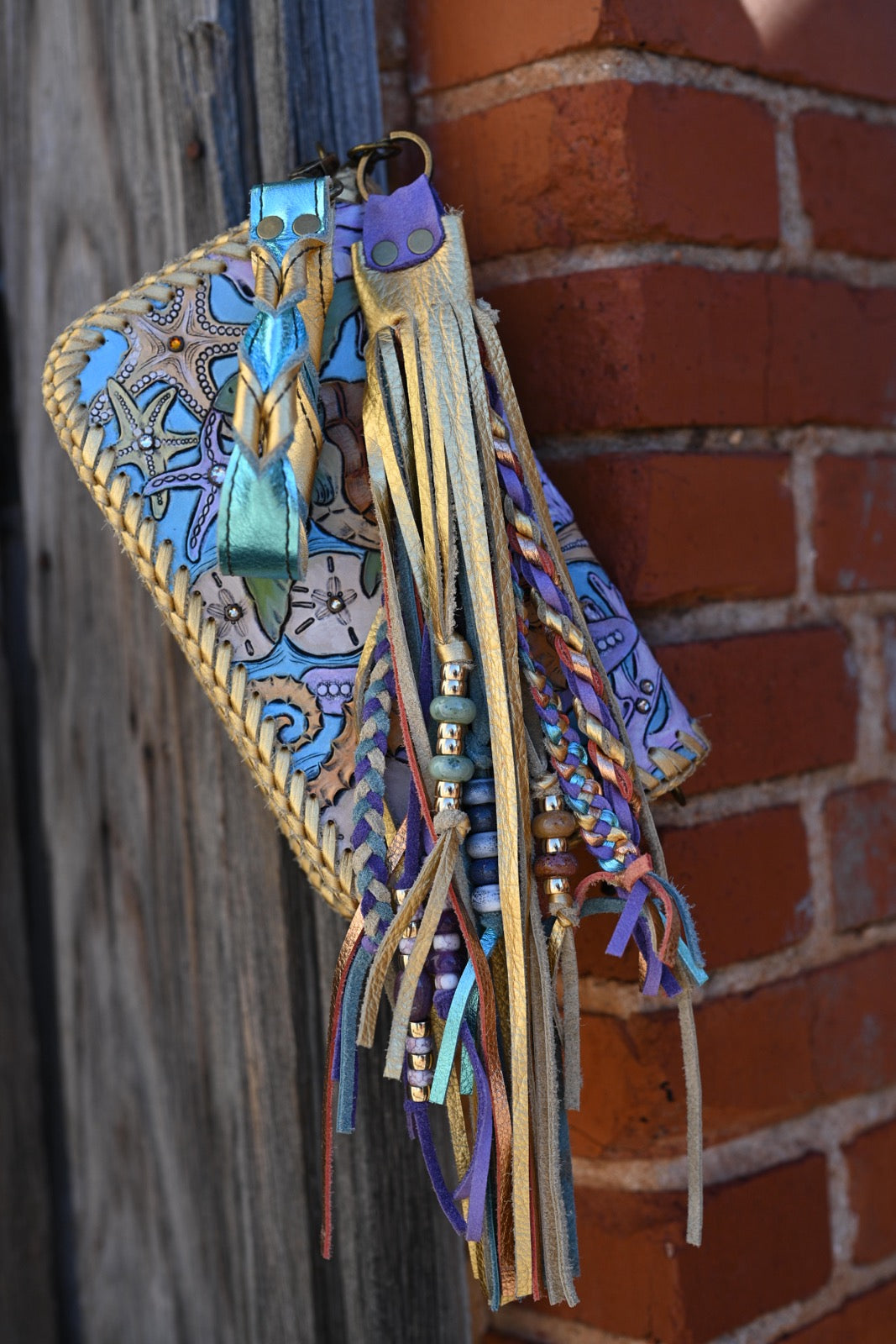 This wallet has 2 sides closed by zippers, has several card slots, zipper coin pocket, can hold a phone. Comes with a removable wristlet strap but it does have two D rings for crossbody option. Measures approximately 8.5”x5”2”.