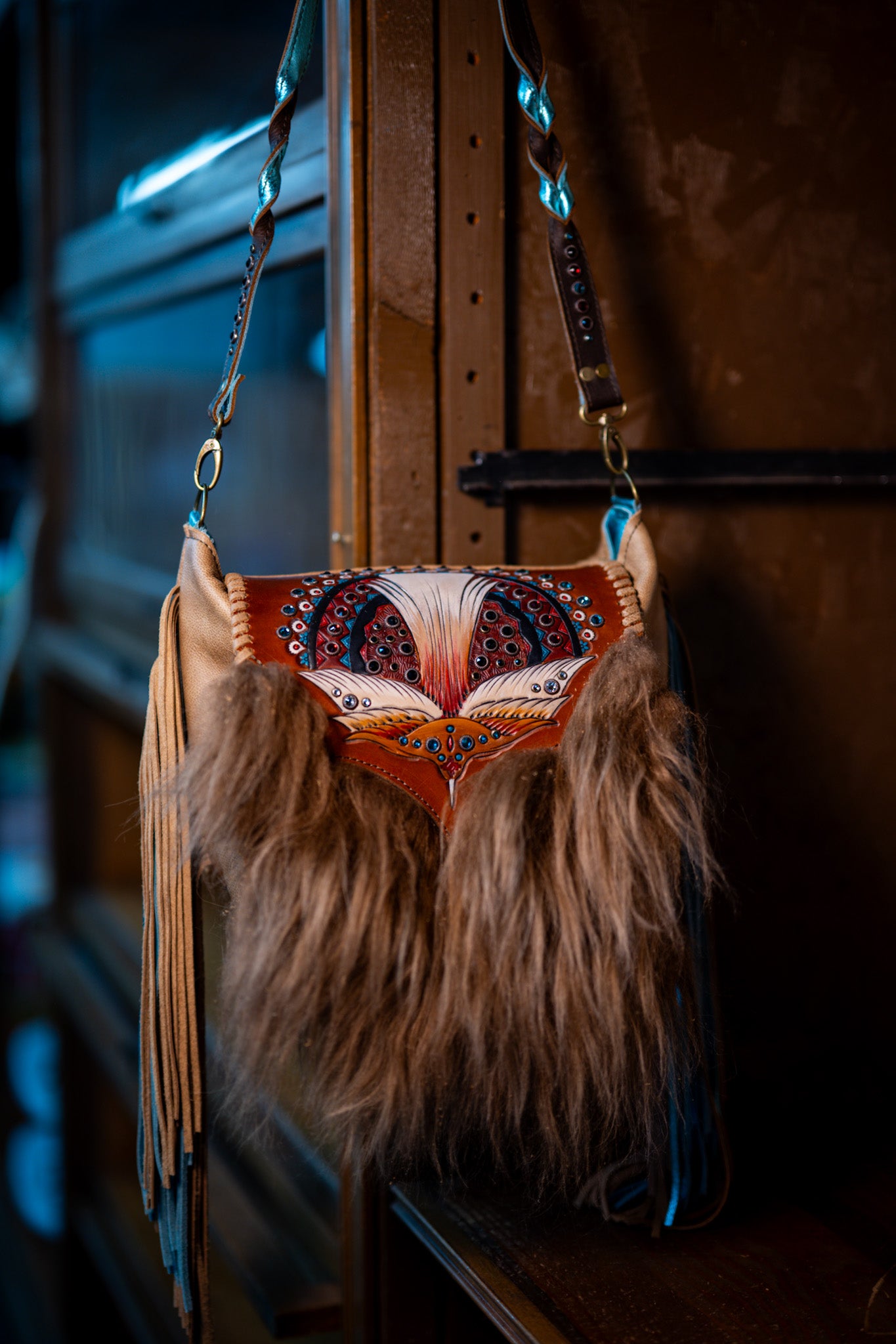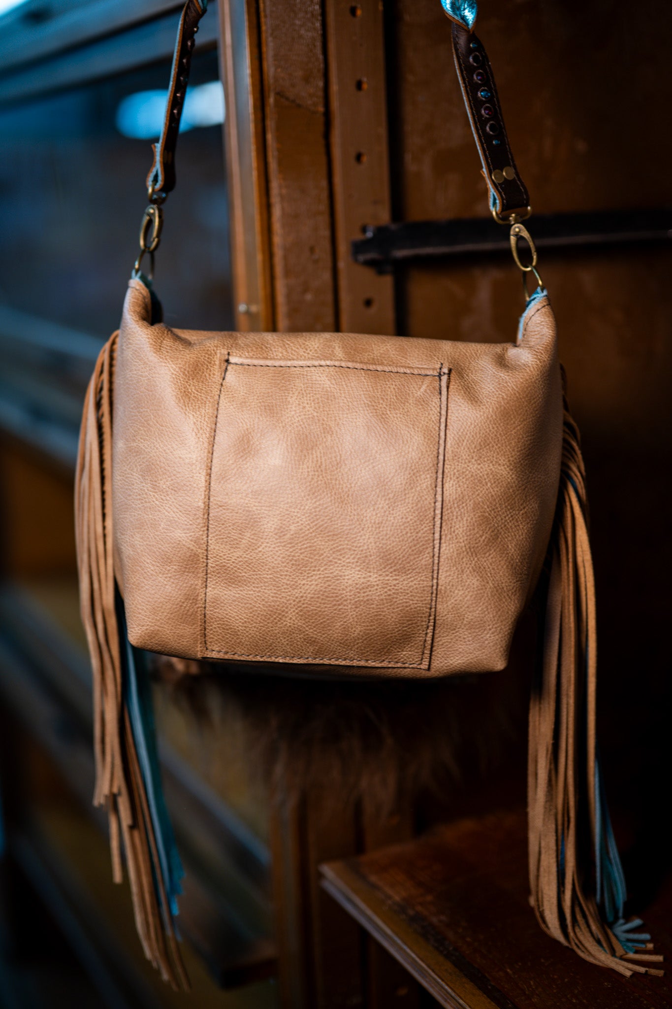 This bag measures 13”x11”x5” and has a 45” crossbody strap. Fringe is 14”. There is a cell phone pocket on the back and the interior is lined and has 3 pockets, one zips. The flap has a magnetic closure.