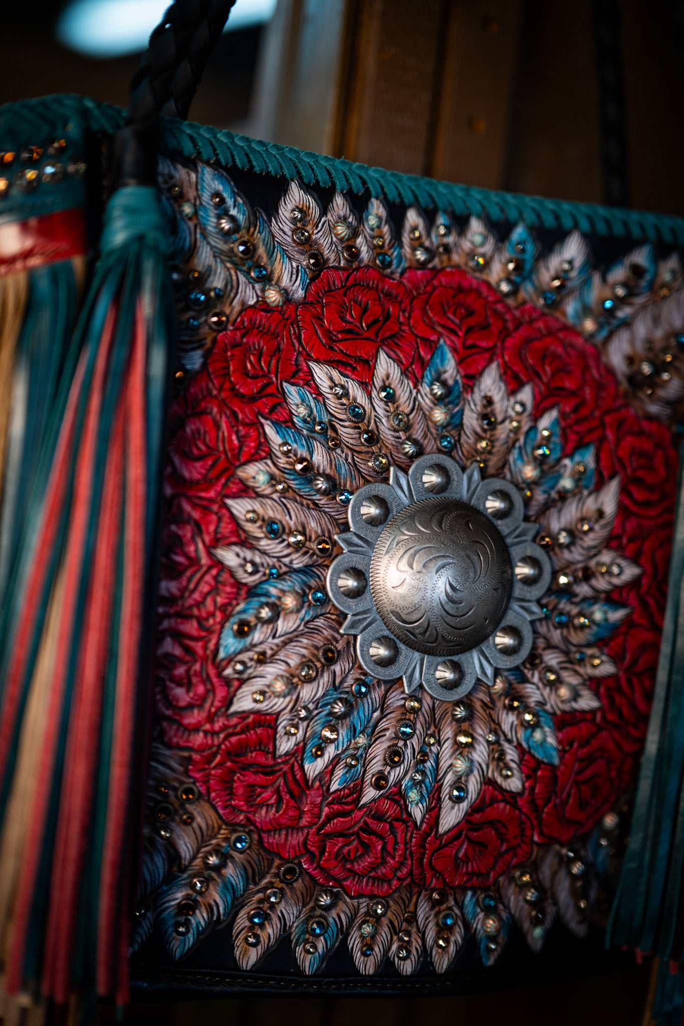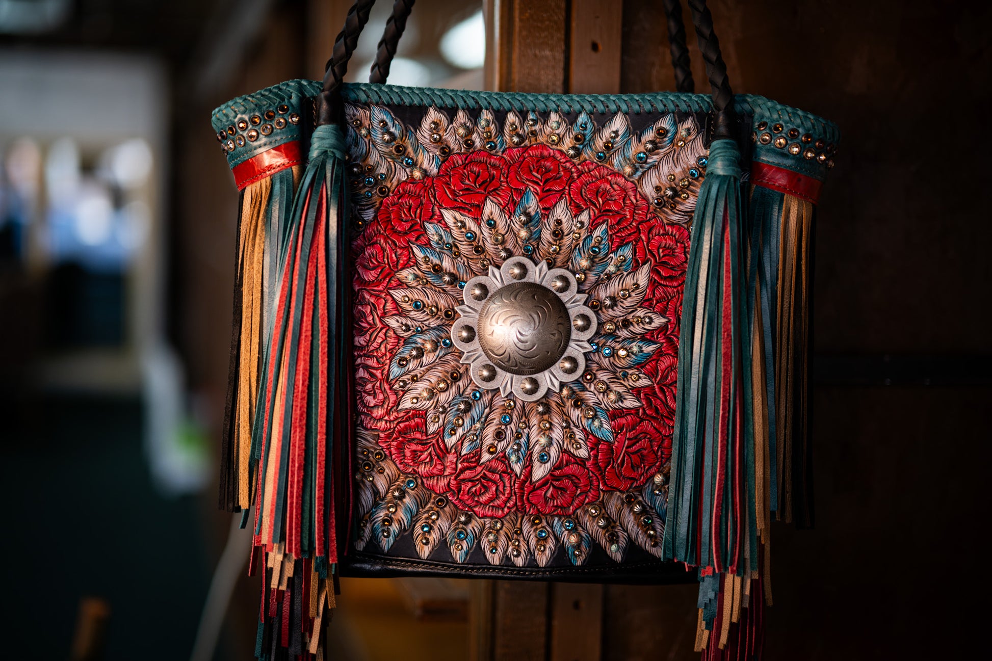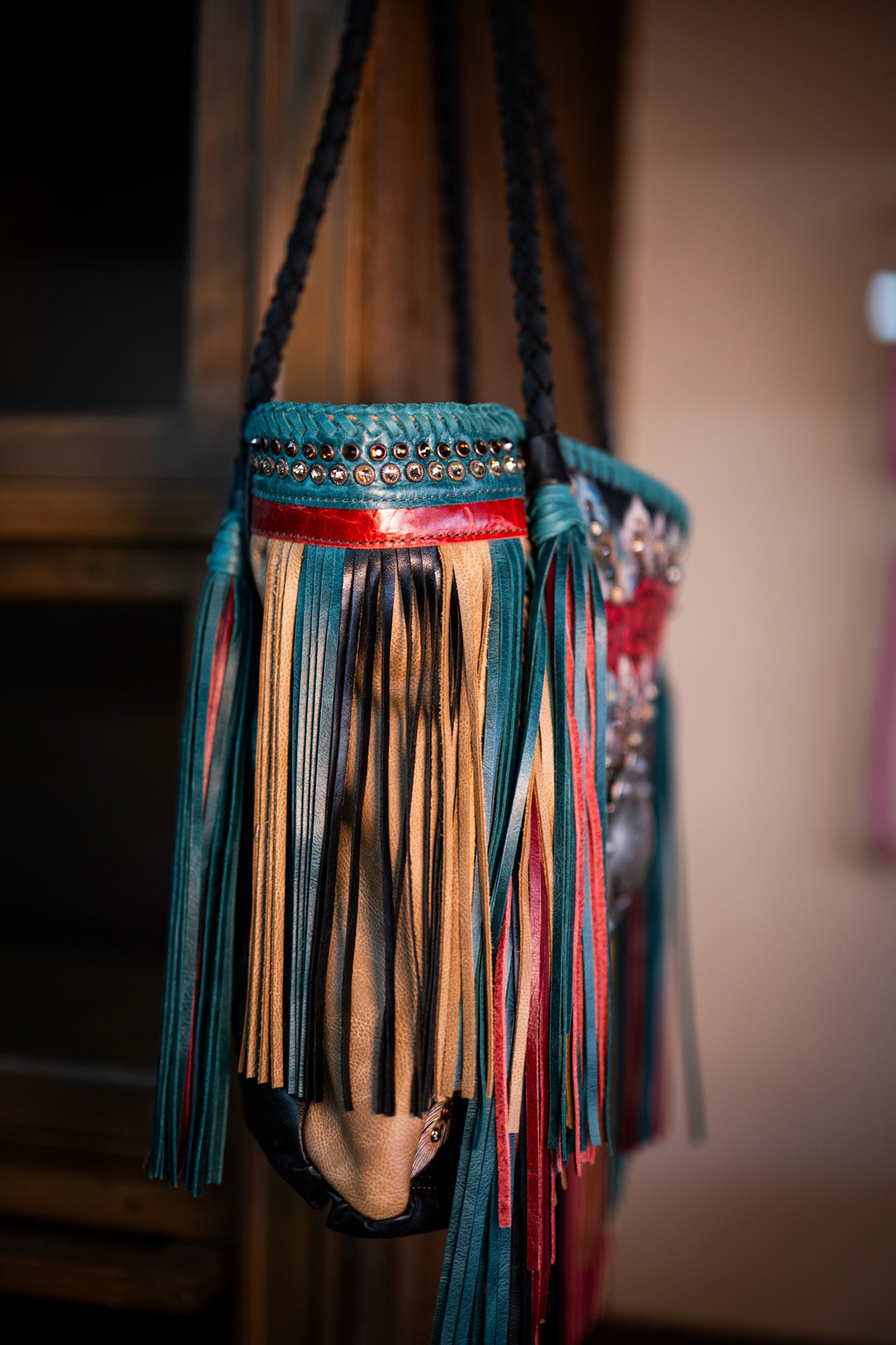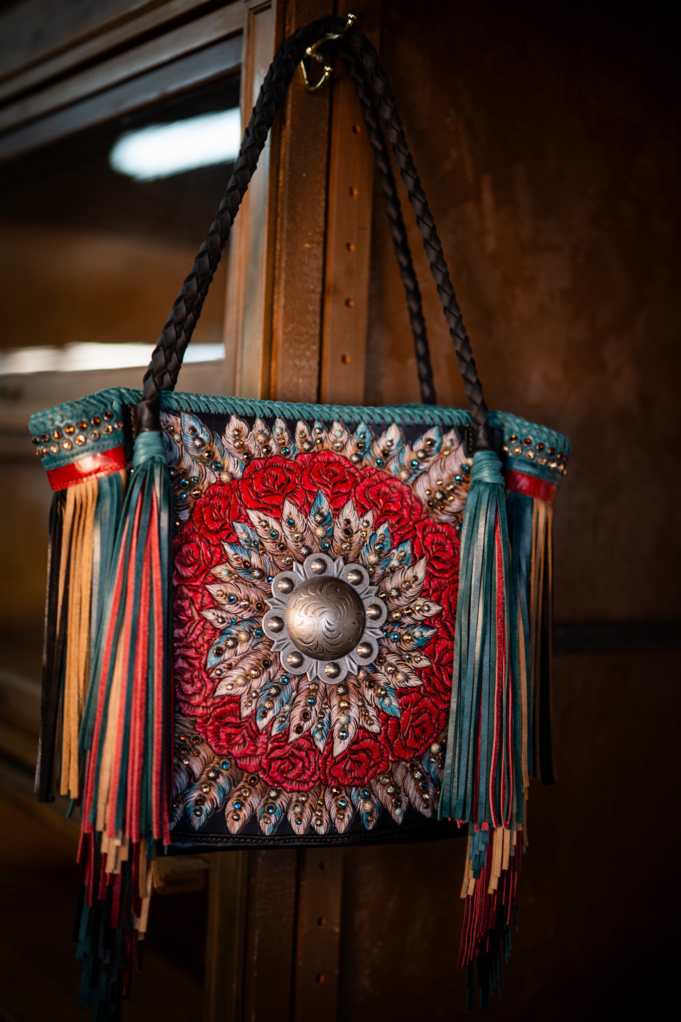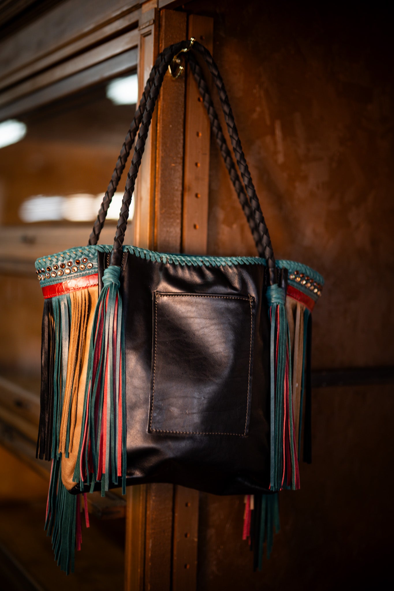 It measures 13”X14” and has a narrowing gusset. Straps are 30”. It is lined with two drop in pockets and one zipping pocket, the back has a cellphone pocket.