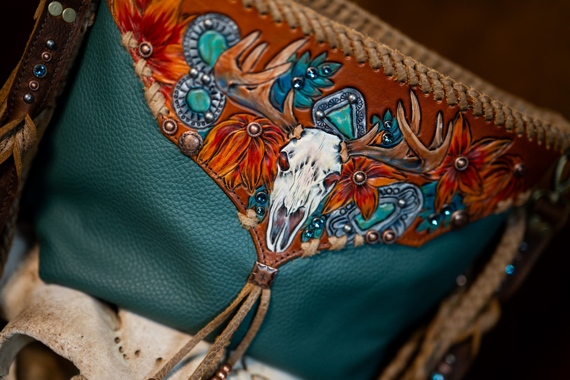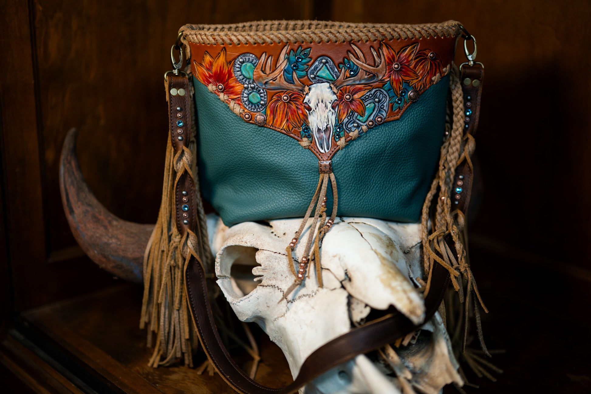 This bag measures 13”X10”X4”. It has 45” crossbody strap and 14” fringe. It is lined with 3 pockets, one zips. It has a cell phone pocket on the back and a zipping closure.
