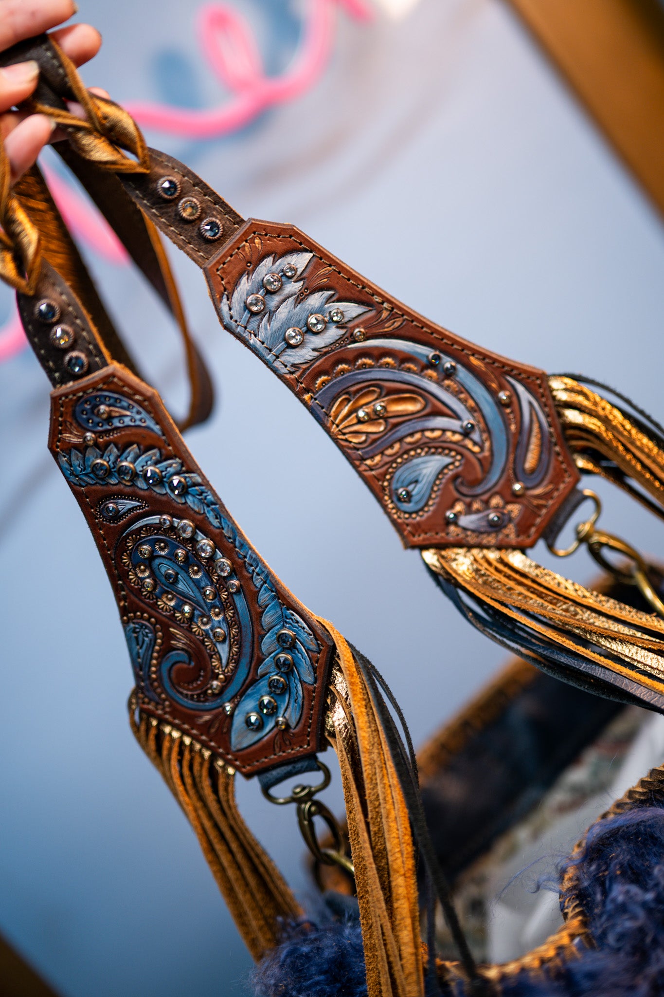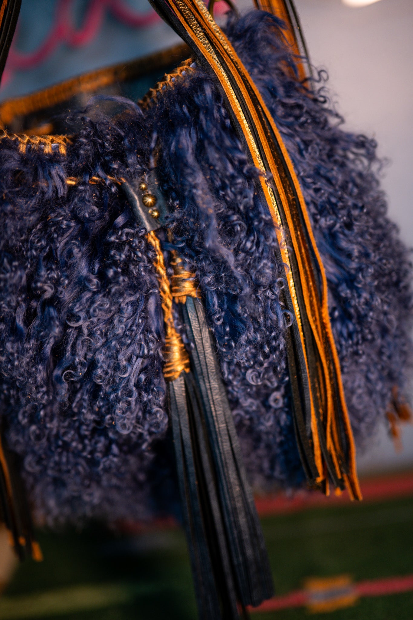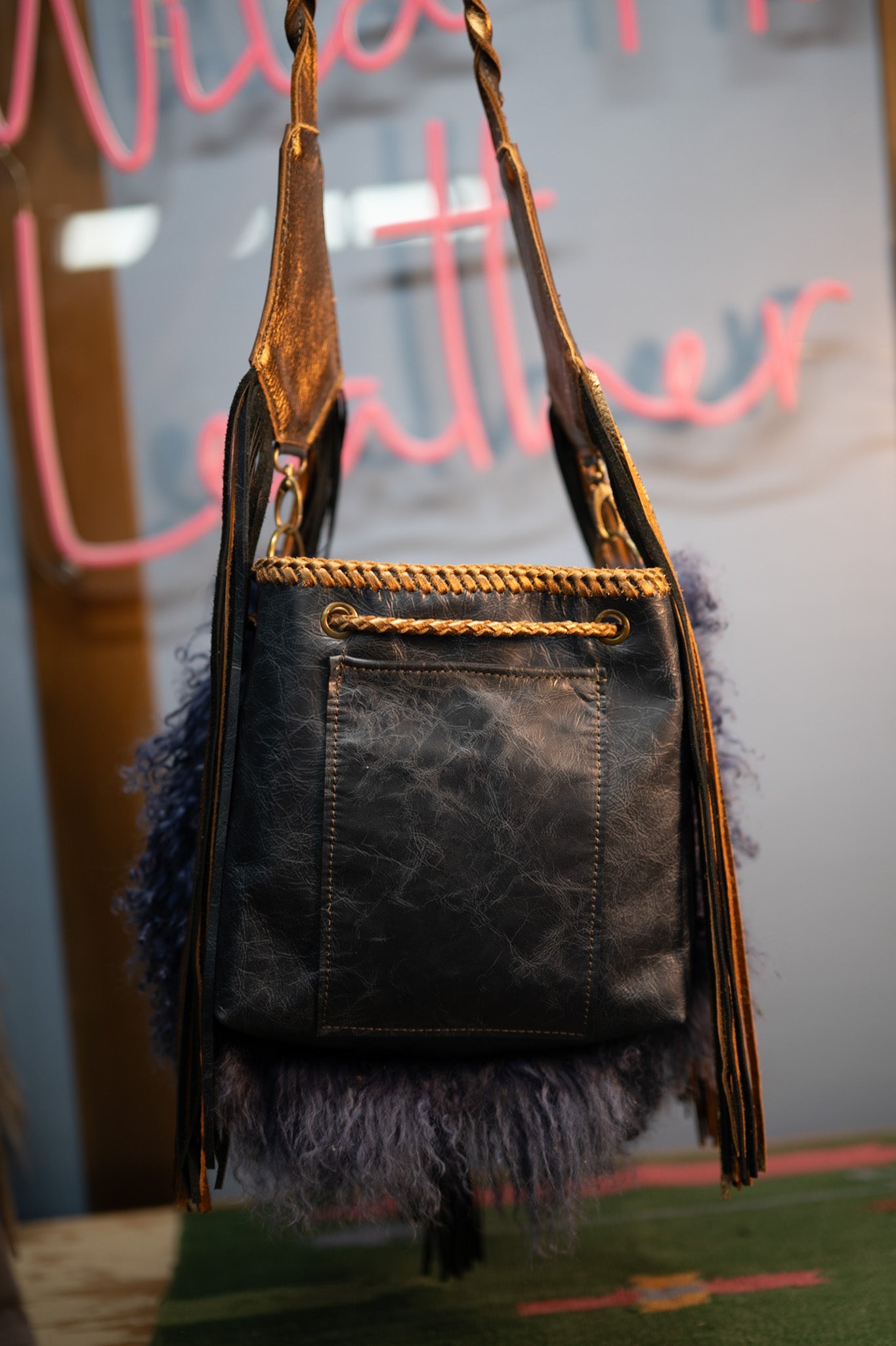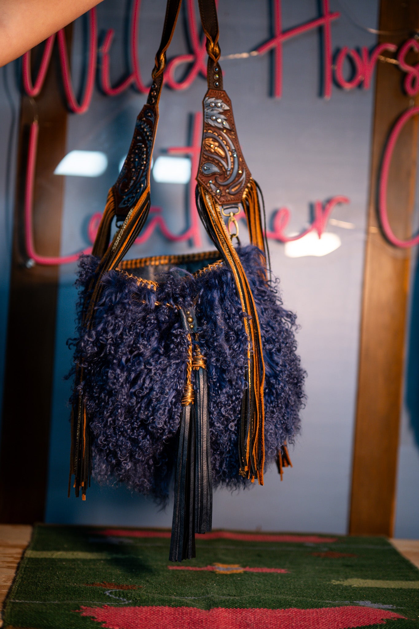 It measures 13”x11”x5” and has a 45” removable crossbody strap with 18” fringe. There is a cell phone pocket on the back and the interior is lined and has 3 pockets, one zips. Tibetan lamb!!!