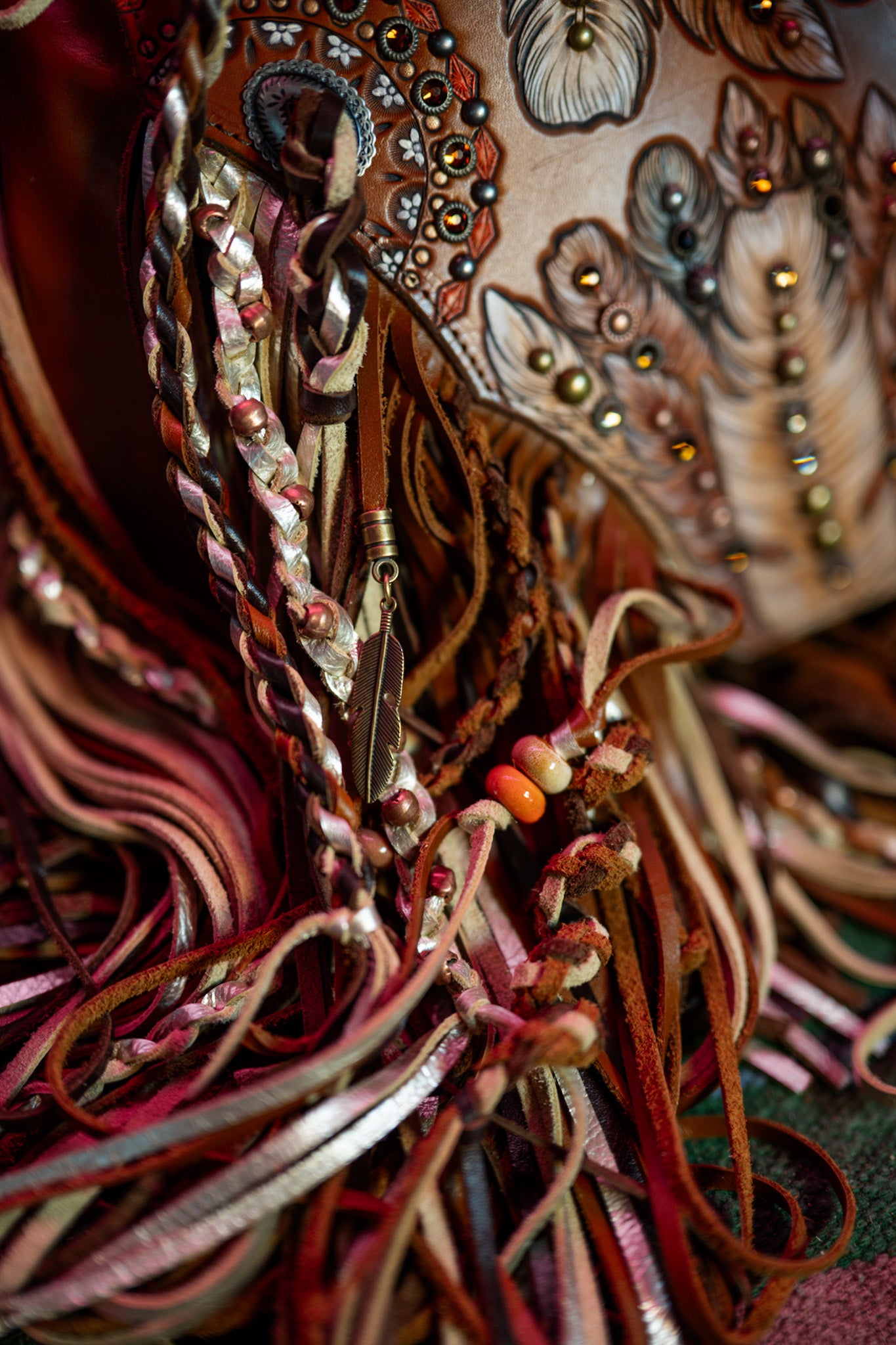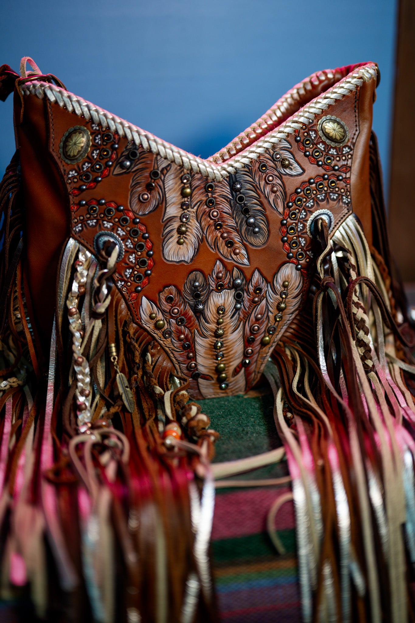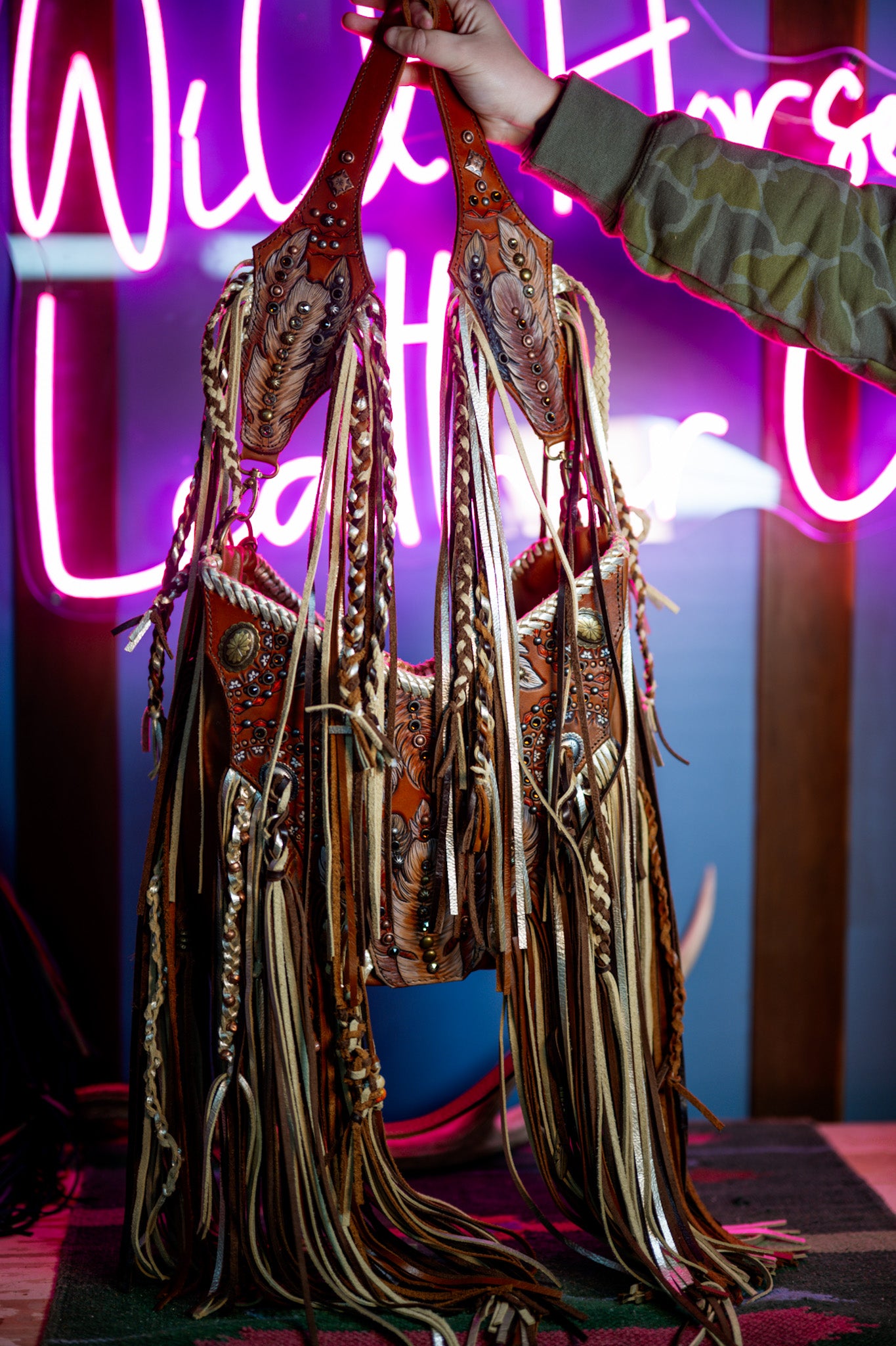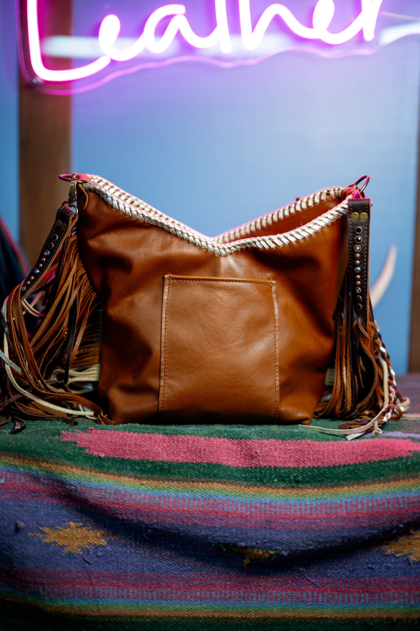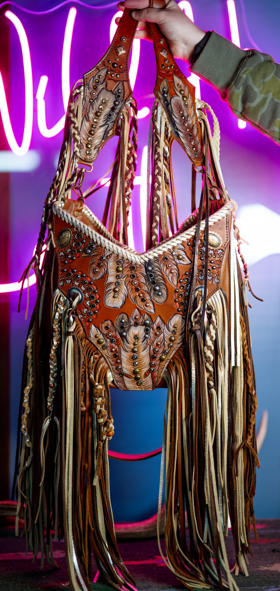 It measures 13”x11”x5” and has a 30” shoulder strap with 18” textured fringe and a 45” crossbody strap, though the neckline of the purse adds several inches. Fringe is a beaded and textured 16”. There is a cell phone pocket on the back and the interior is lined with one zipping pocket and two small drop in pockets. The bag has a magnetic closure.