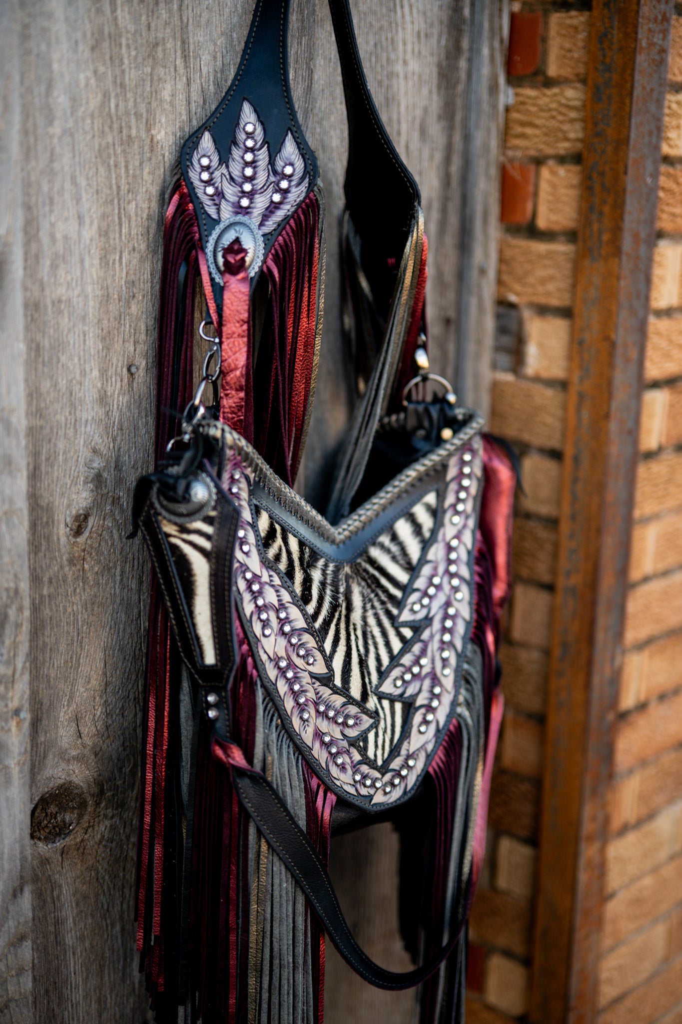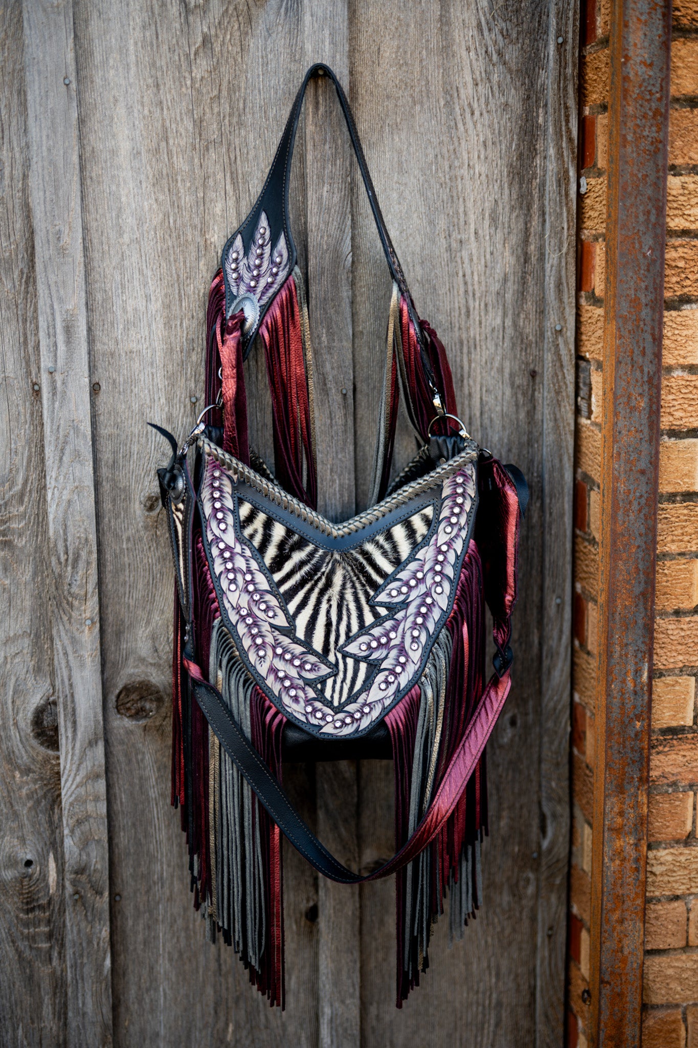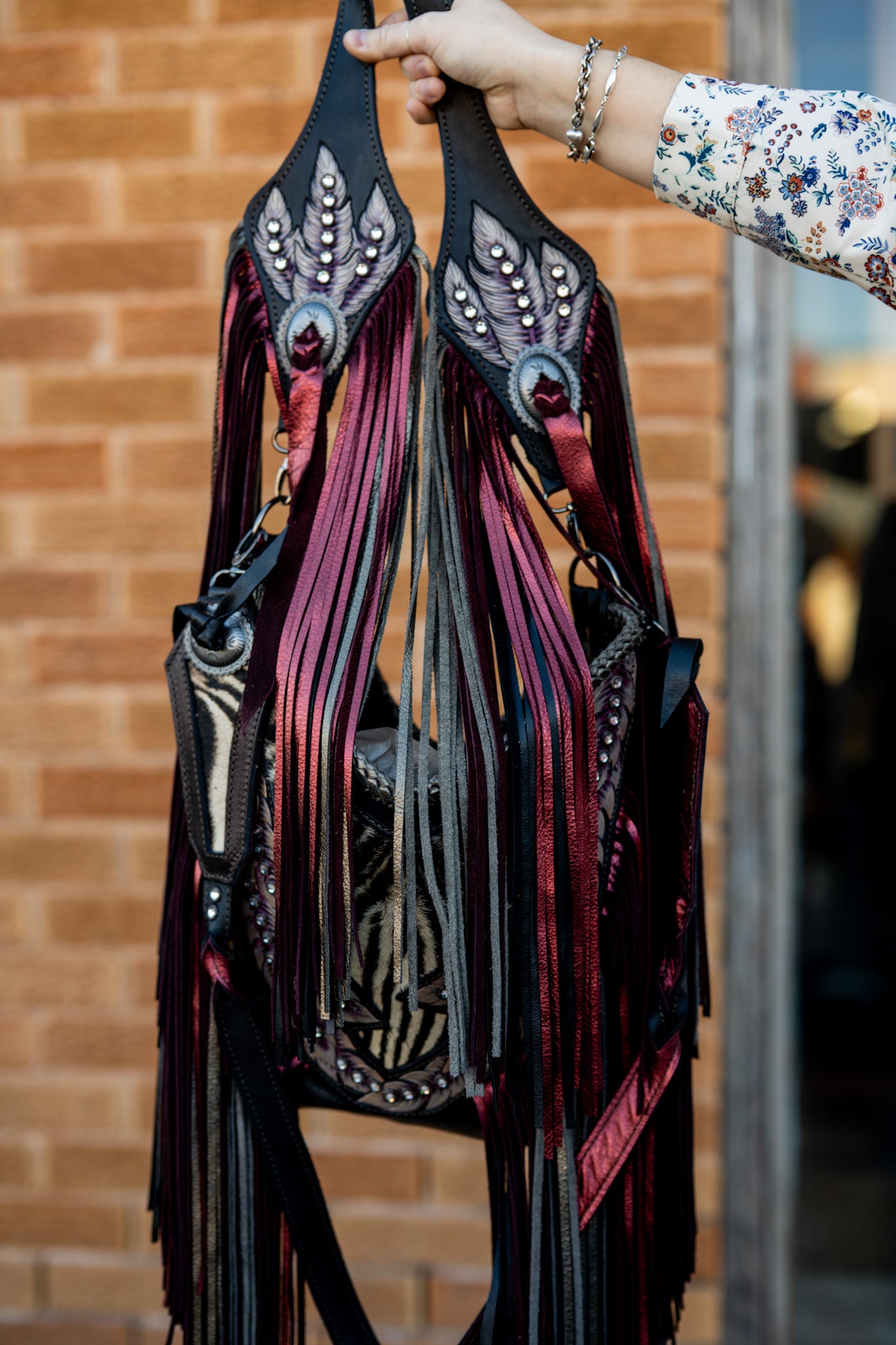 It measures 13”x11”x5” and has a 30” shoulder strap and 45” crossbody strap, though the neckline of the purse adds several inches. Fringe is 14” on the bag and 18” on the strap. There is a cell phone pocket on the back and the interior is lined with one zipping pocket and two small drop in pockets. The bag has a magnetic closure!