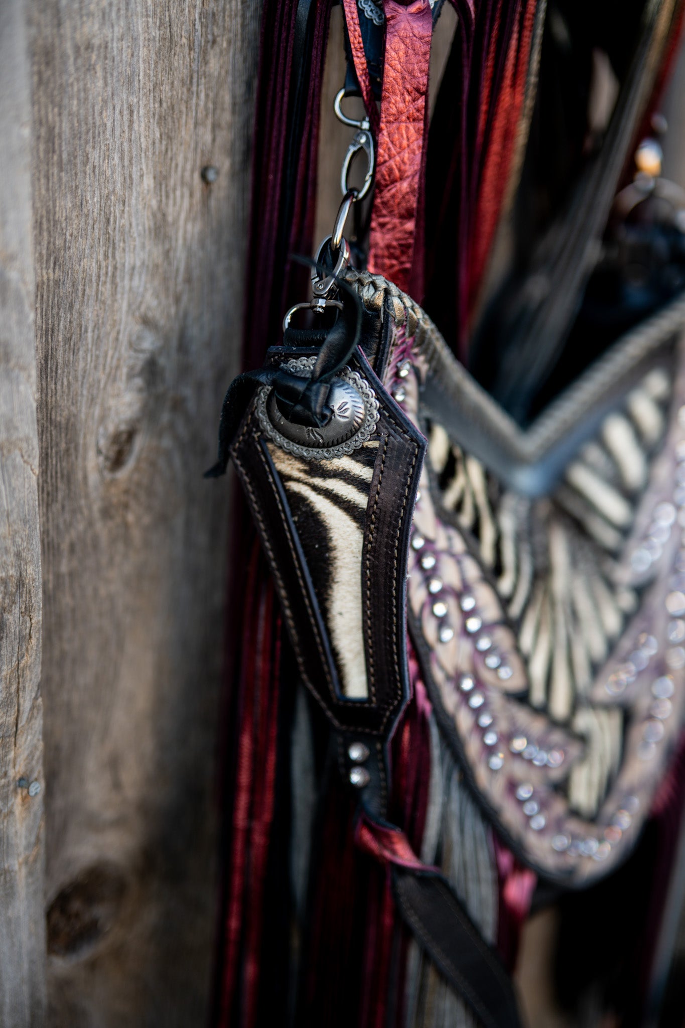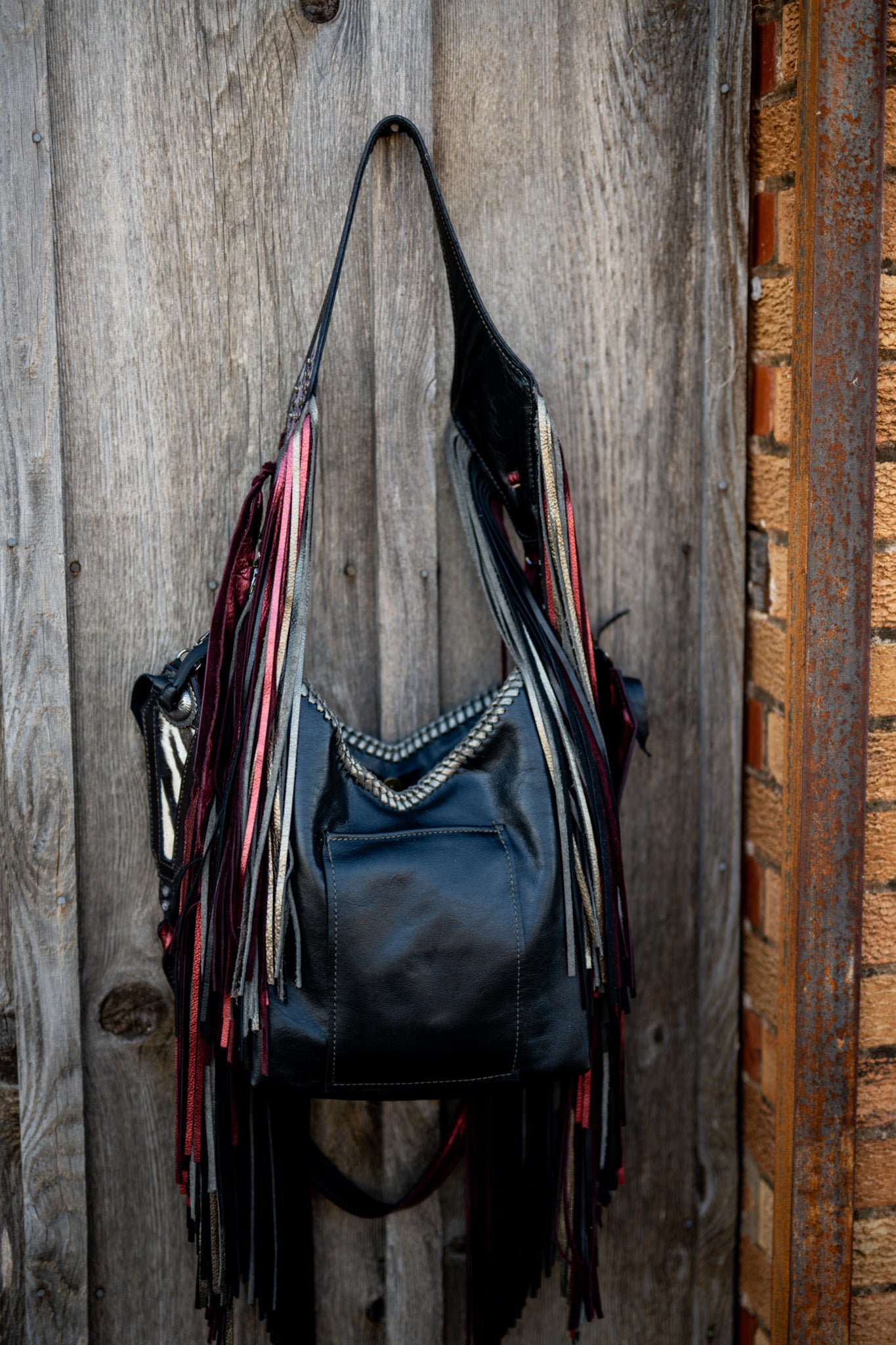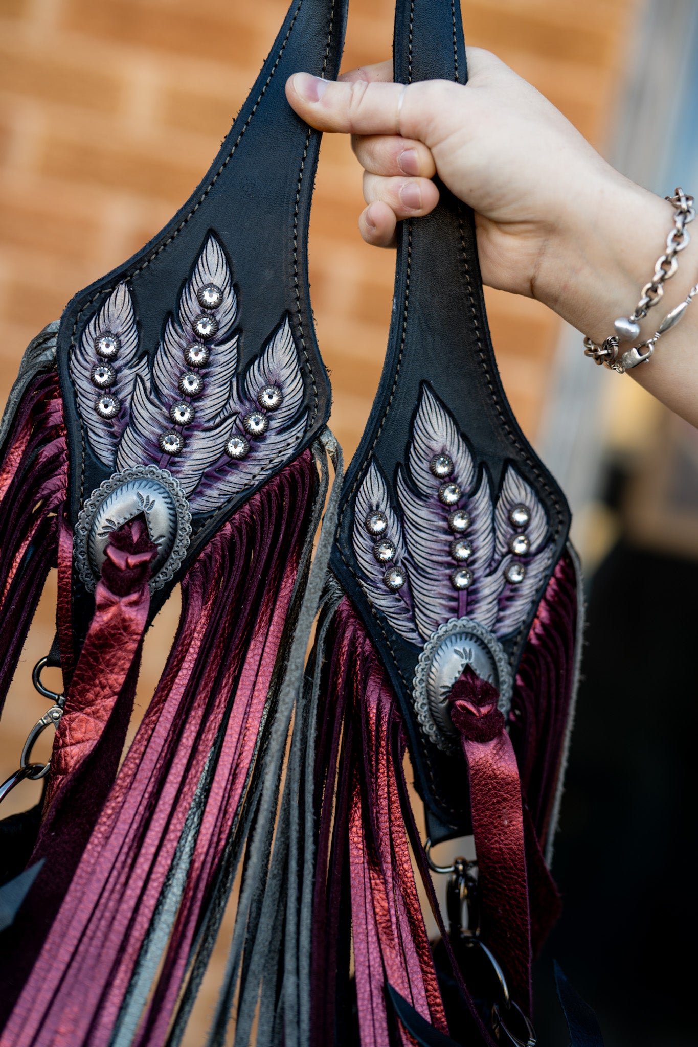 It measures 13”x11”x5” and has a 30” shoulder strap and 45” crossbody strap, though the neckline of the purse adds several inches. Fringe is 14” on the bag and 18” on the strap. There is a cell phone pocket on the back and the interior is lined with one zipping pocket and two small drop in pockets. The bag has a magnetic closure!